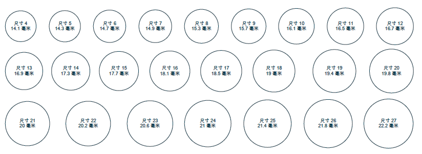 注意:所顯示的尺寸都針對美國及加拿大尺寸。要找到您的戒指尺寸,測量您的手指,然